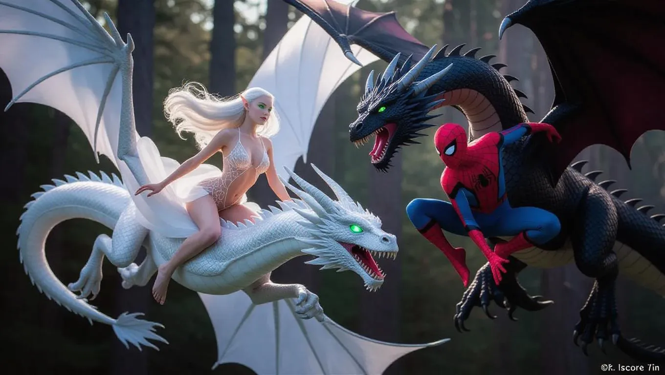 "score_9, score_8_up, score_7_up, an elven girl with long white hair, pointy ears, and glowing green eyes rides a radiant silver dragon through a mystical forest sky. Her sheer, see-through dress flows in the wind, revealing underboob and sideboob, her glowing skin framed in soft light. Her hourglass figure and large breasts shimmer as the dragon lets out a deafening roar. Opposite her, Spider-Man clings to a massive obsidian-scaled dragon, red-and-blue suit flaring with tension. The two dragons spiral around one another, wings slicing the mist, claws crashing in mid-air, magical fire exploding between them. Ethereal sparks rain down on the ancient forest below. NSFW, solo, fantasy art, highly detailed, high contrast, film grain, 8k. Cinematic wide shot, dynamic camera angles capturing the intense aerial battle."