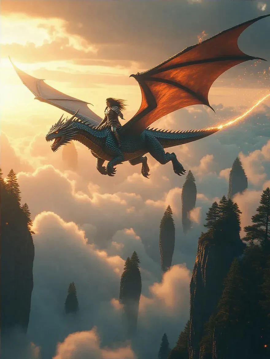 Create an epic fantasy scene with a warrior riding a dragon above floating islands, fierce winds, bright clouds, and magic trails. High-angle shot transforms text into stunning AI-generated visuals with VivaGo.ai's creative tools.