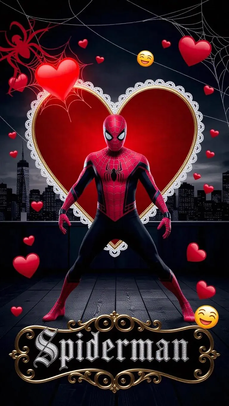 J♥ – Peter Parker / Spider-Man – Heartbeat Hustle Framed inside a stylized poker card for the jack of hearts, rich velvet red with soft gold lining, delicate curved design, lace embellishments. In 2 corners is a glowing red heart, shrouded in silver web. The stylized gothic sign at the bottom reads "Spiderman" in elegant, embossed cursive. The background is a dark New York City rooftop skyline with drifting spider webs and floating love emojis. A full-size male figure standing in a hip-hop dance pose, one leg forward, knees bent, arms bent in the middle of the groove. Tight-fitting red and blue Spider-Man suit with web texture, black spider emblem glowing on the chest. Mask removed - expressive face with tousled brown hair, confident smirk. Headphones hang around the neck, bracers for shooting web are visible. A moment frozen before movement. Playing card format. The character is fully framed, a full-length vertical composition.