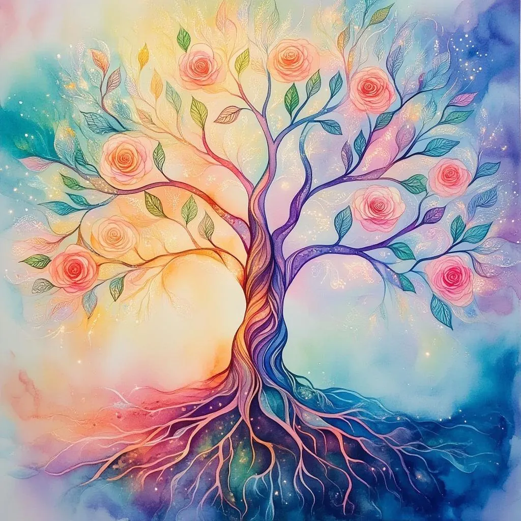 Create stunning AI-generated watercolor abstract art of the Tree of Life with intricate branches, ethereal angelic motifs, and radiant light. Symbolize divine connection through delicate rose patterns and a spiritual aura. Perfect for symbolic and mystical art lovers. Transform your vision into professional-grade visuals using Vivago.ai's AI tools.