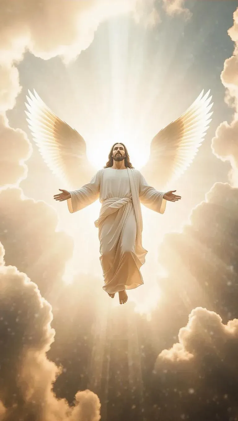 Create celestial AI art of Jesus with glowing wings amidst heavenly clouds using vivago.ai. Transform text prompts into divine visuals for spiritual content, worship materials, or inspirational designs with professional-grade AI image generation and ethereal effects.