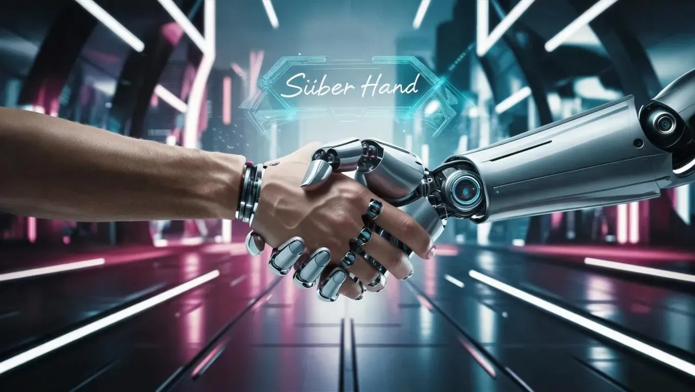 Capture realistic AI-generated visuals of a human hand shaking a Siber Hand bionic prosthesis. Highlight seamless human-robot interaction, advanced prosthetic technology, and lifetailored greetings with vivago.ai's AI effects for professional creative projects in robotics, innovation, and futuristic design.