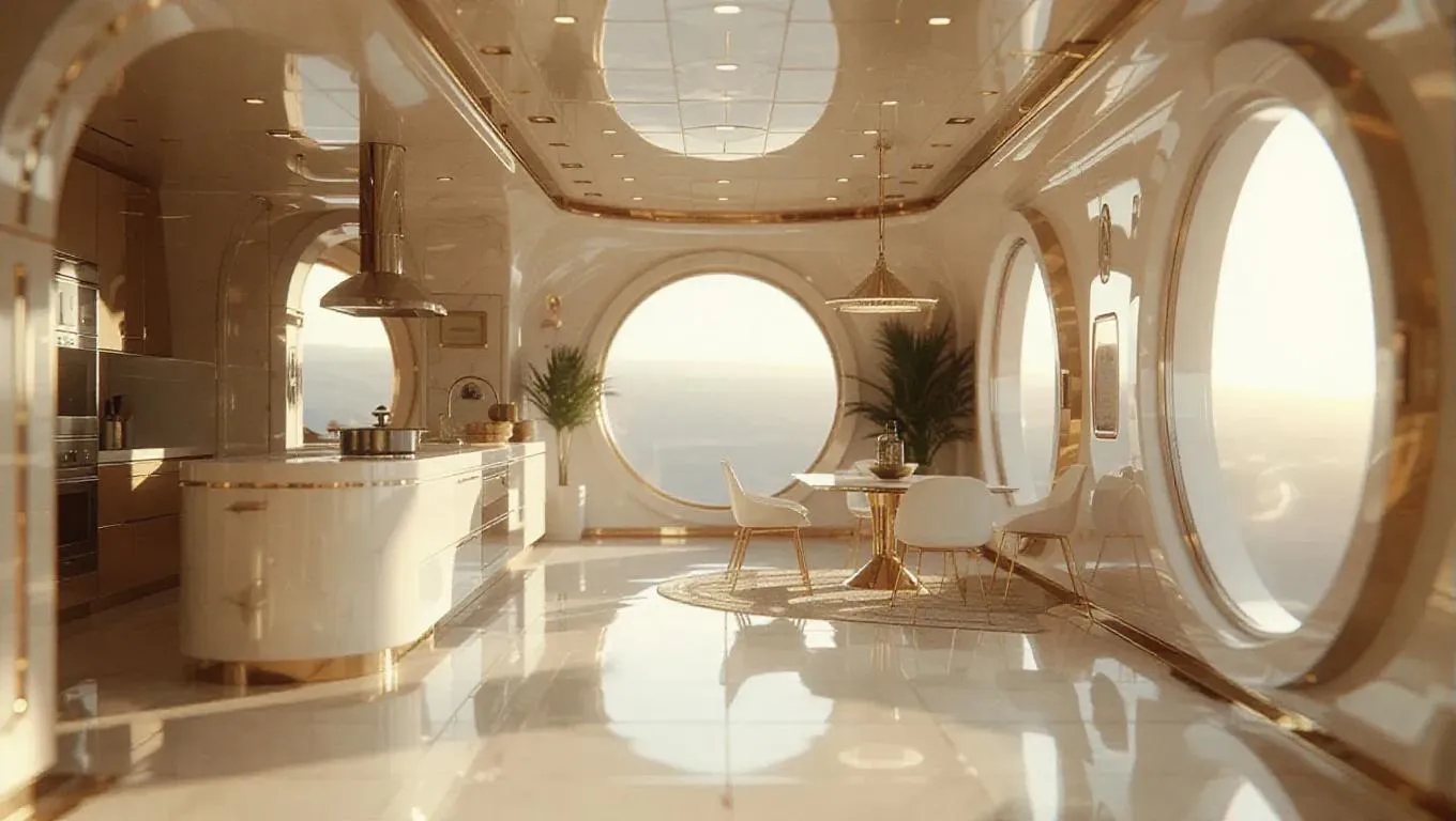 Transform text into stunning visuals with Vivago.ai's AI image generator. Create a cinematic 8K Ultra HD close-up of an Art Nouveau spacecraft solarium kitchen blending retro-futuristic design, high-tech details, and photorealistic realism. Perfect for sci-fi enthusiasts seeking hyper-detailed, masterpiece-grade compositions with porcelain accents, space views, and ultra-realistic lighting in 3:4 aspect ratio.