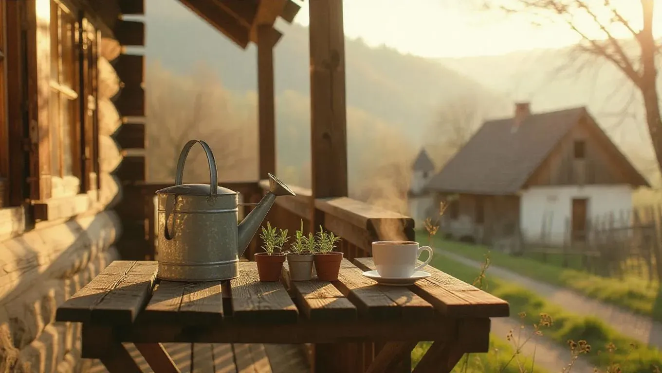 Capture the rustic charm of a quaint Hungarian village with this AI-generated spring scene. An old cottage basks in sunshine, its porch adorned with seedlings, a watering can, and steaming coffee—vivid details brought to life through AI creativity.