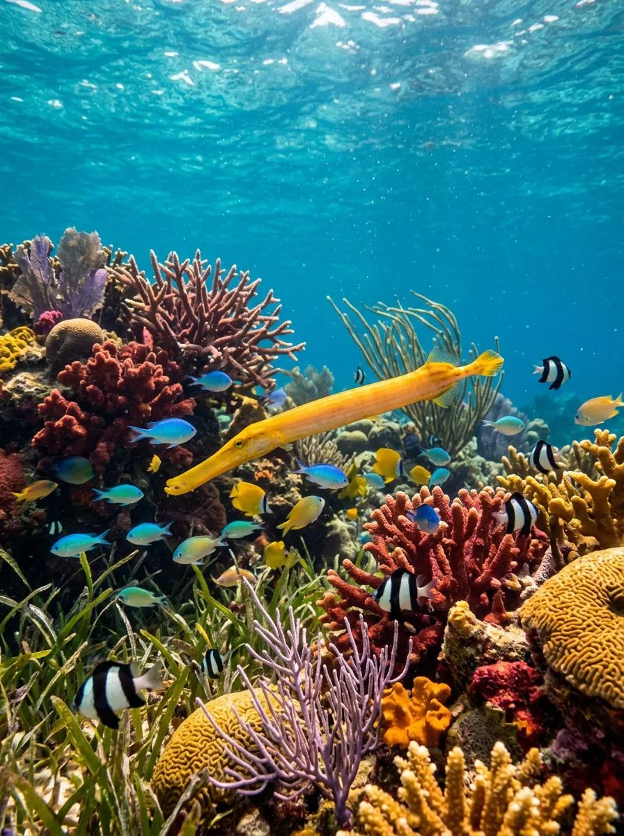 A vibrant Trumpfish swims gracefully through a coral reef, surrounded by colorful tropical fish and swaying sea plants, under the shimmering turquoise waters, capturing the essence of marine life's beauty and tranquility.