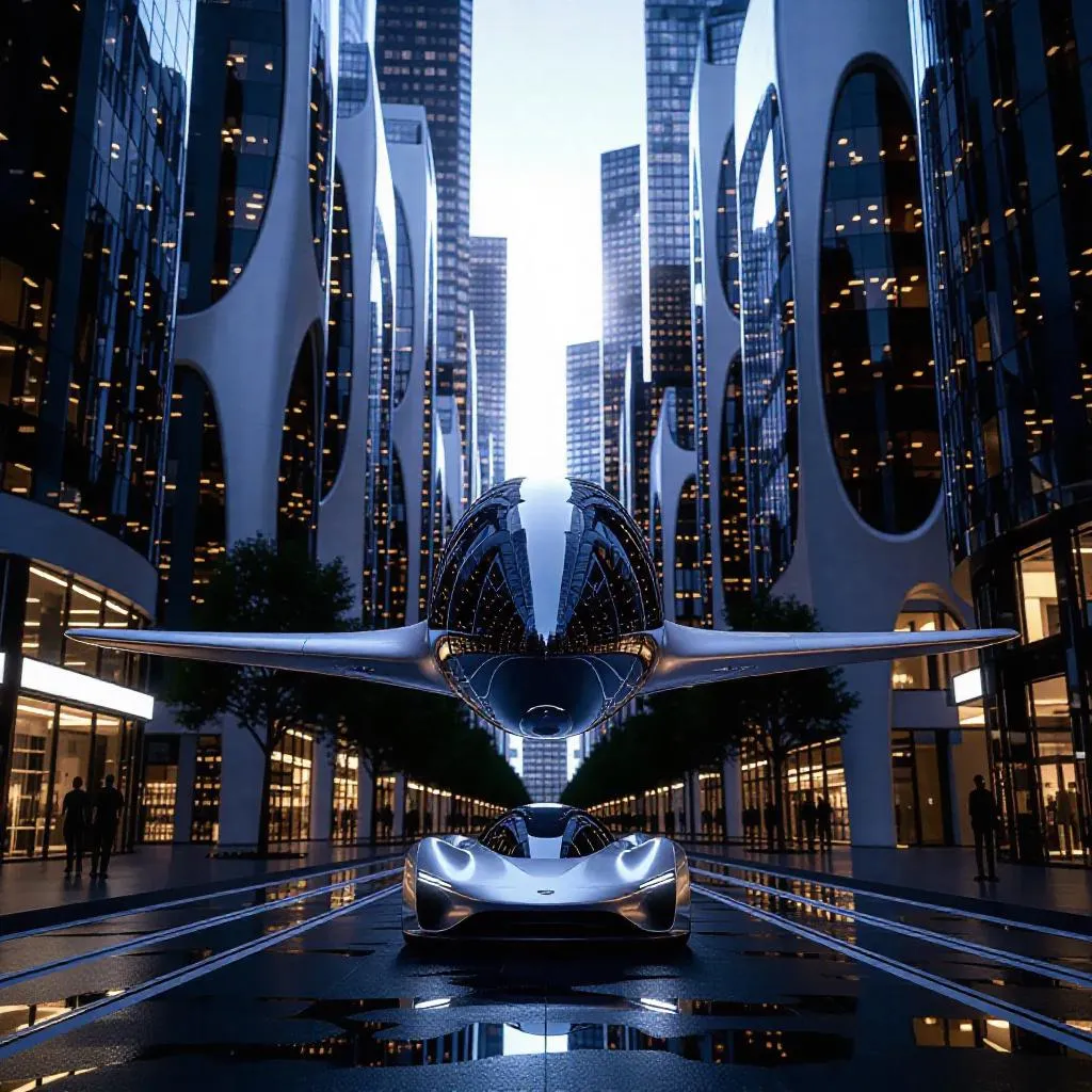 Generate photorealistic futuristic European cityscapes with AI. Explore sleek hybrid car-aircraft designs, eco-friendly skyscrapers blending organic geometry with glass-metal surfaces, and harmonious urban environments. Create immersive, light-filled metropolises using Vivago.ai's advanced AI tools for hyper-realistic visuals and sustainable futurism concepts.