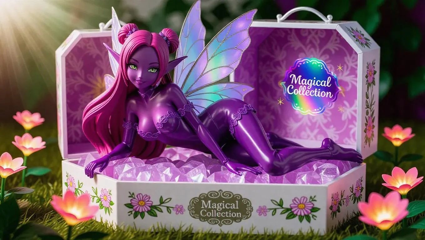 A highly detailed anime-style collectible figure of a playful fairy with deep violet skin, long flowing pink hair, and glowing green eyes. She wears a revealing purple latex outfit with floral lace trim, posed gracefully on a crystal-clear base. The figure is packaged in a whimsical toy box with floral inner lining, silver embossing, and a holographic "Magical Collection" label. Set against a bright fantasy-themed toy garden with glowing flowers and leafy shadows. Soft, radiant light casts gentle highlights on her form, enhancing her charm. Style: anime, with a touch of fairy tale and whimsy elements.