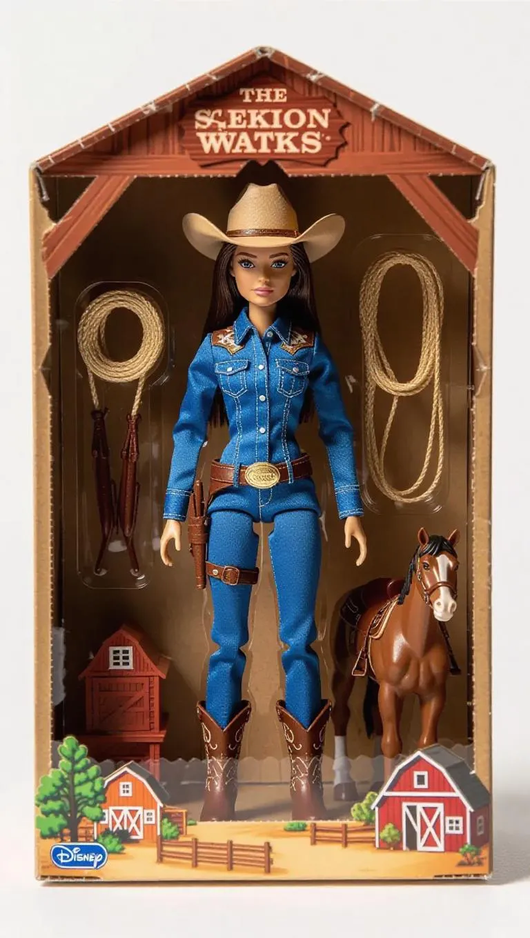 A high-quality product photograph of an action figure box set featuring a cowgirl. The action figure is packaged inside a western-themed cardboard box with a clear front window. The figure, detailed and slightly stylized, wears a cowboy hat and denim attire. Included are a miniature barn, a lasso, a pair of boots, and a tiny horse. Studio style, clean background, professional lighting, emphasizing the intricate details and premium packaging.