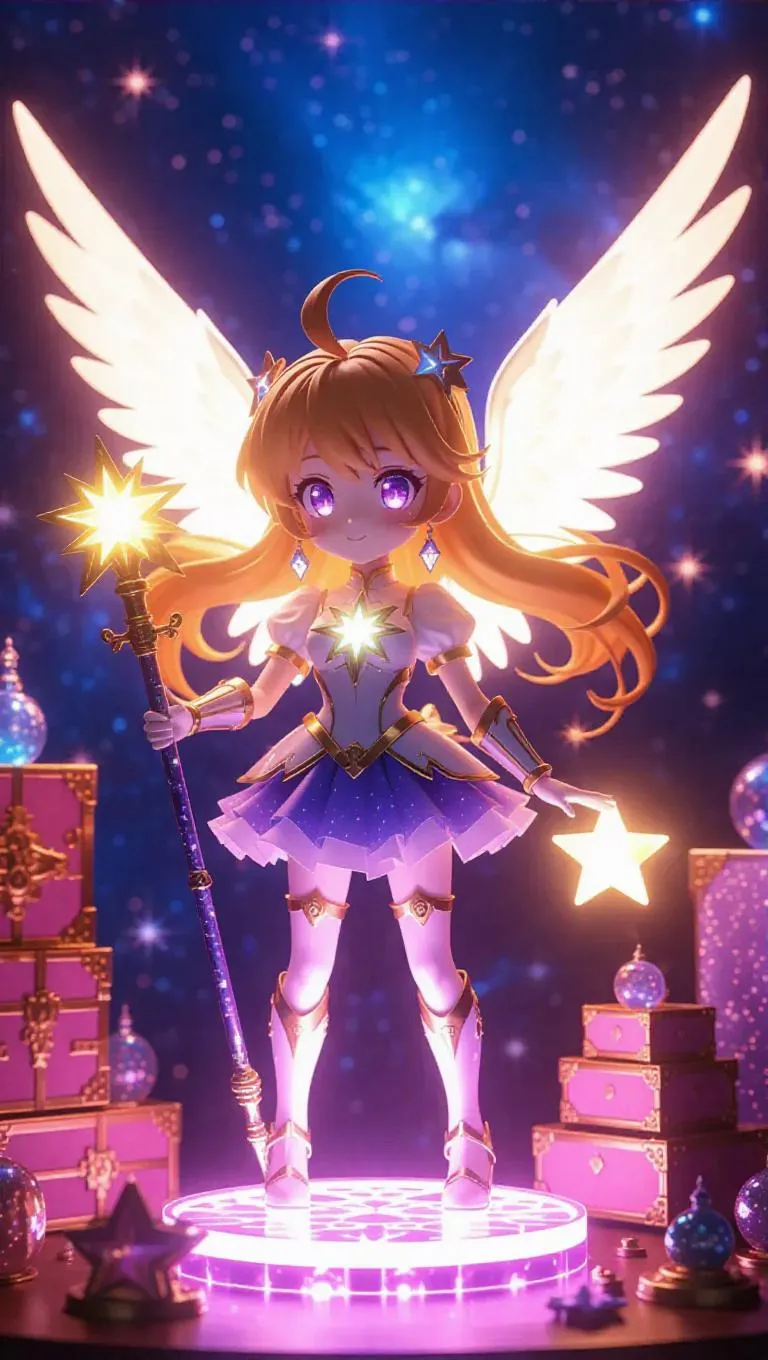 A magical girl action figure with glowing white wings, a cosmic staff, and luminous eyes stands in a mystical pose. Her toy box is adorned with celestial designs and features her in a celestial magical stance, complete with additional star-shaped accessories. The background is a cosmic toy workshop, filled with galaxy-inspired light that emphasizes the colors and creates a stellar atmosphere. Style: Realistic with astral influences.