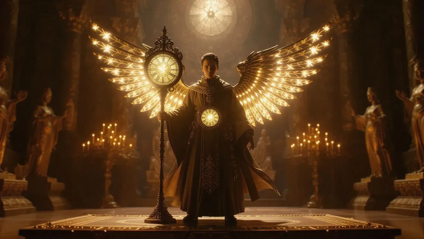 A time traveler action figure with intricate clock-shaped wings and an hourglass staff glowing with radiant golden light. Wears a flowing robe adorned with celestial symbols. The toy box showcases an ancient scroll design. Background: A temple filled with statues, offerings, and murals depicting celestial events. Style: Mythological.