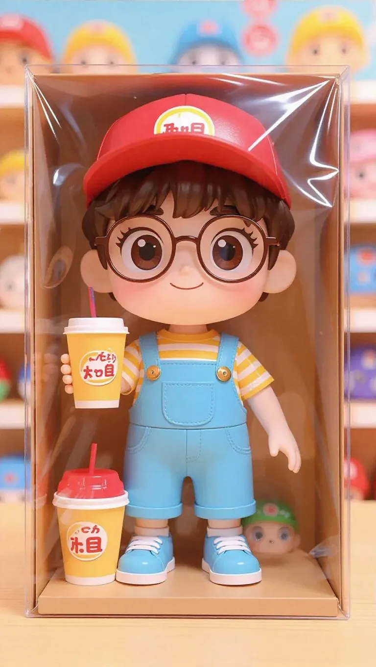 C4D, a light brown paper toy box is completely wrapped in transparent plastic film. The box body has a large observation window to show the inside. A 3D cartoon-style boy doll is wearing light blue overalls with a yellow and white striped shirt, dark brown slightly curly short hair with eyebrow bangs, a round face with big brown eyes and thick eyebrows, a red and white baseball cap and square-framed glasses, holding a bubble milk tea cup, and wearing thick-soled sports shoes. The package contains two changeable baseball caps and three pairs of shoes of different styles. The background features a toy store display stand in soft tones. The plastic packaging film reflects the ambient light, presenting a transparent texture. The overall picture is full of the delicacy of a collectible figurine