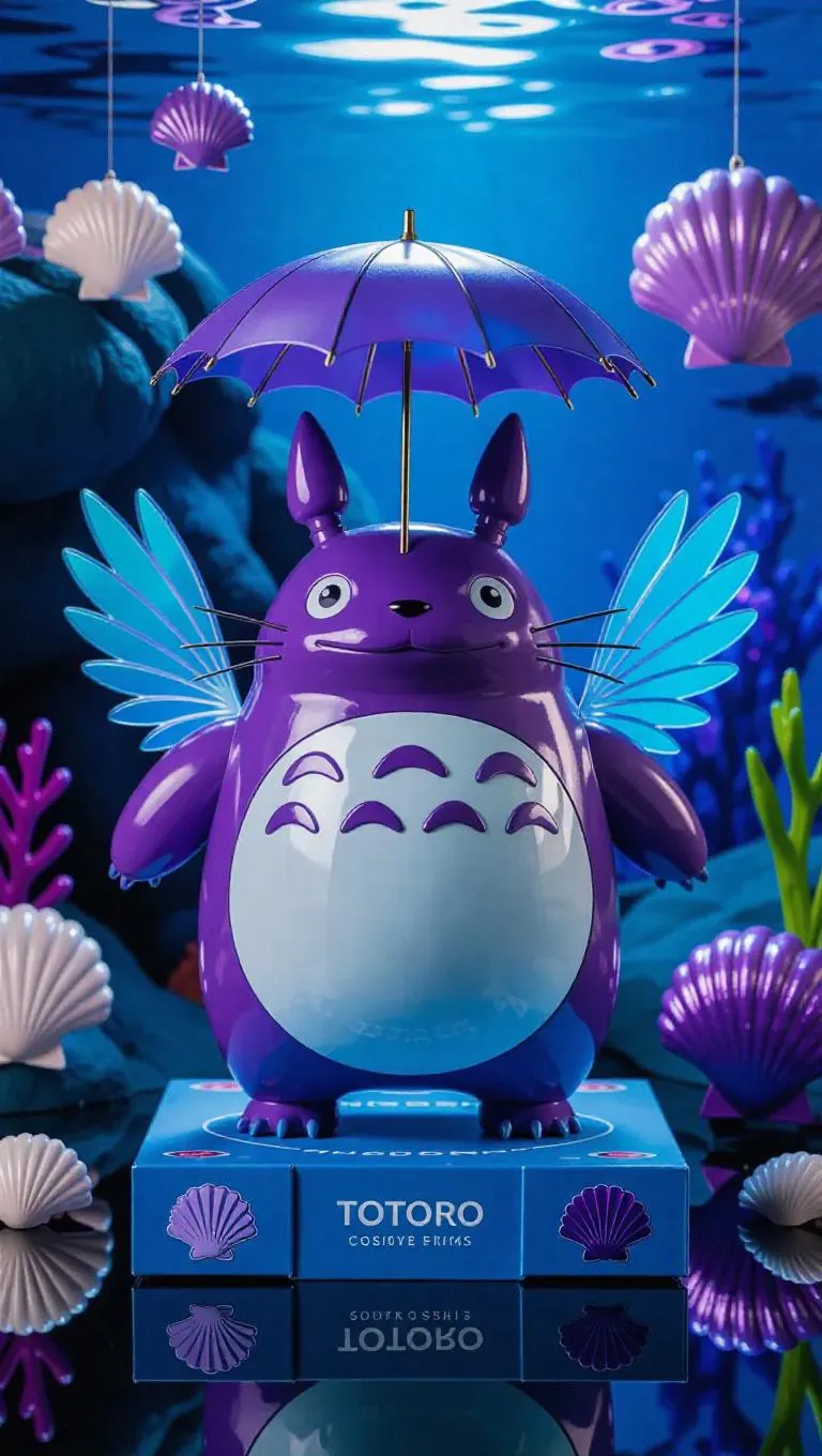 A high-gloss lavender and ocean-blue robotic Totoro mech figure with plume wings and a shell-launching umbrella stands prominently. The packaging features underwater-themed designs and shell-shaped holographic labels, including bonus gear fins. The background showcases an aquatic toy reef with floating mechanical shells and a vibrant, ocean-inspired atmosphere. Soft, shimmering light casts delicate highlights, enhancing the glossy finish. Style: Playful and aquatic with a touch of mermaid flair.