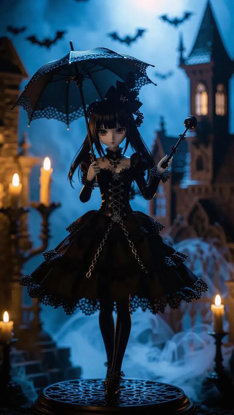 A gothic lolita action figure, dark and fierce, dressed in a lavish dress adorned with intricate lace and chain motifs. Wields a parasol that transforms into an explosive device. Toy box showcases a hauntingly beautiful tower surrounded by swirling mist. Background: A shadowy dungeon with flickering candles casting creepy silhouettes.