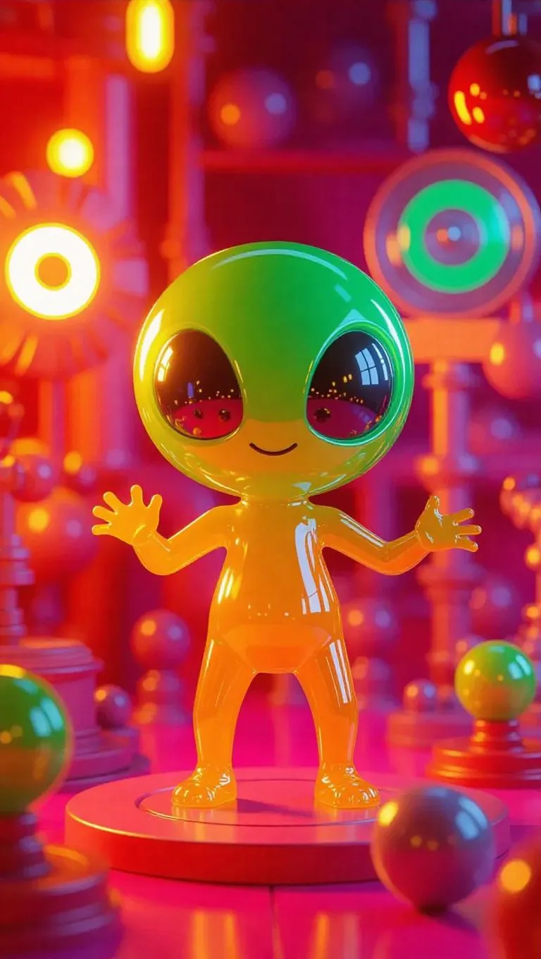 A toy alien jelly figure made of soft pliable material, showcasing bubble-like eyes and elastic trails. The box is illustrated with kinetic-themed graphics, including a spinner-shaped accessory and motion elements. The factory setting is a dynamic toy workshop, filled with spinning and whirling gadgets. Bright, animated lighting highlights the gelatinous texture, creating an engaging and active atmosphere. The style is dynamic and slightly energetic, merging motion with playful designs.