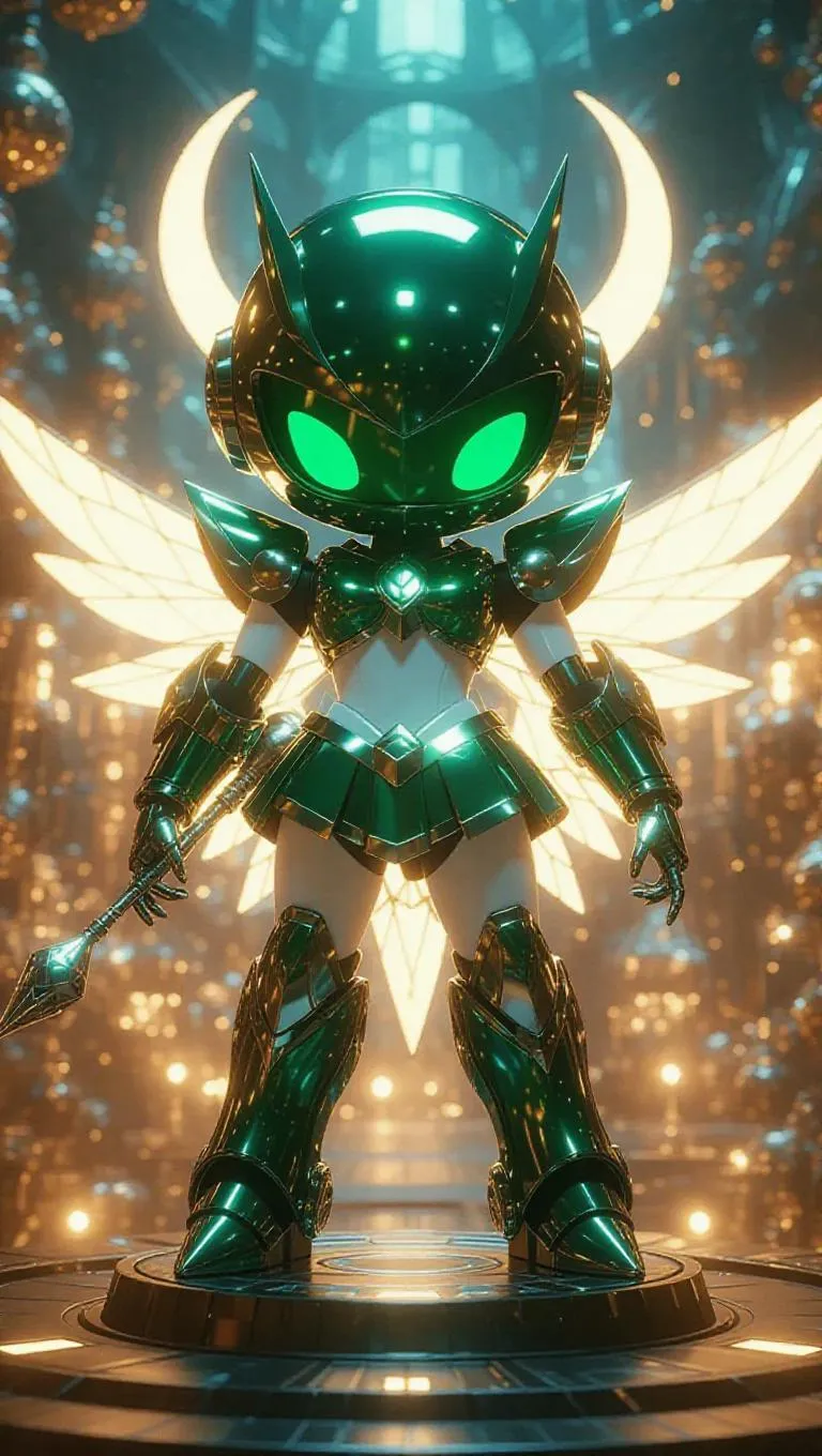A high-gloss emerald and cream robotic Sailor Mystic mech figure with crescent moon wings and a magic-launching wand stands prominently. The packaging is adorned with mystic-themed designs and crescent moon-shaped holographic labels, featuring bonus gear arms. The background showcases a magical toy factory filled with floating mechanical mysteries and a whimsical, celestial atmosphere. Soft, warm light casts gentle highlights, enhancing the figure’s glossy finish. Style: Cute and futuristic with a touch of cyberpunk flair.