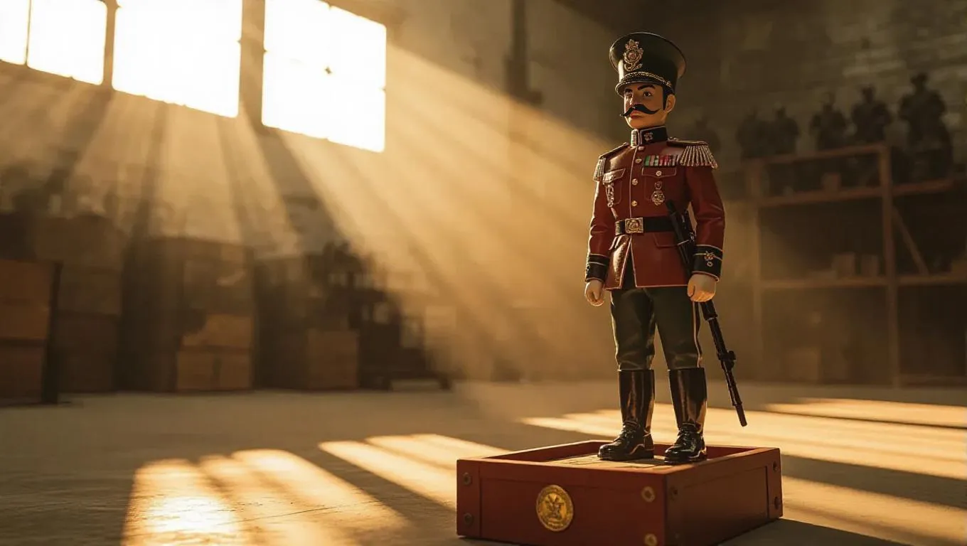 An antique toy soldier with brass accents stands at attention on a parade ground platform inside his army-themed packaging. The box displays a removable medal sticker. In a dimly lit military toy factory, grey-orange floodlights cast stark shadows on concrete walls, enhancing the disciplined, bold atmosphere. Realistic military aesthetics.