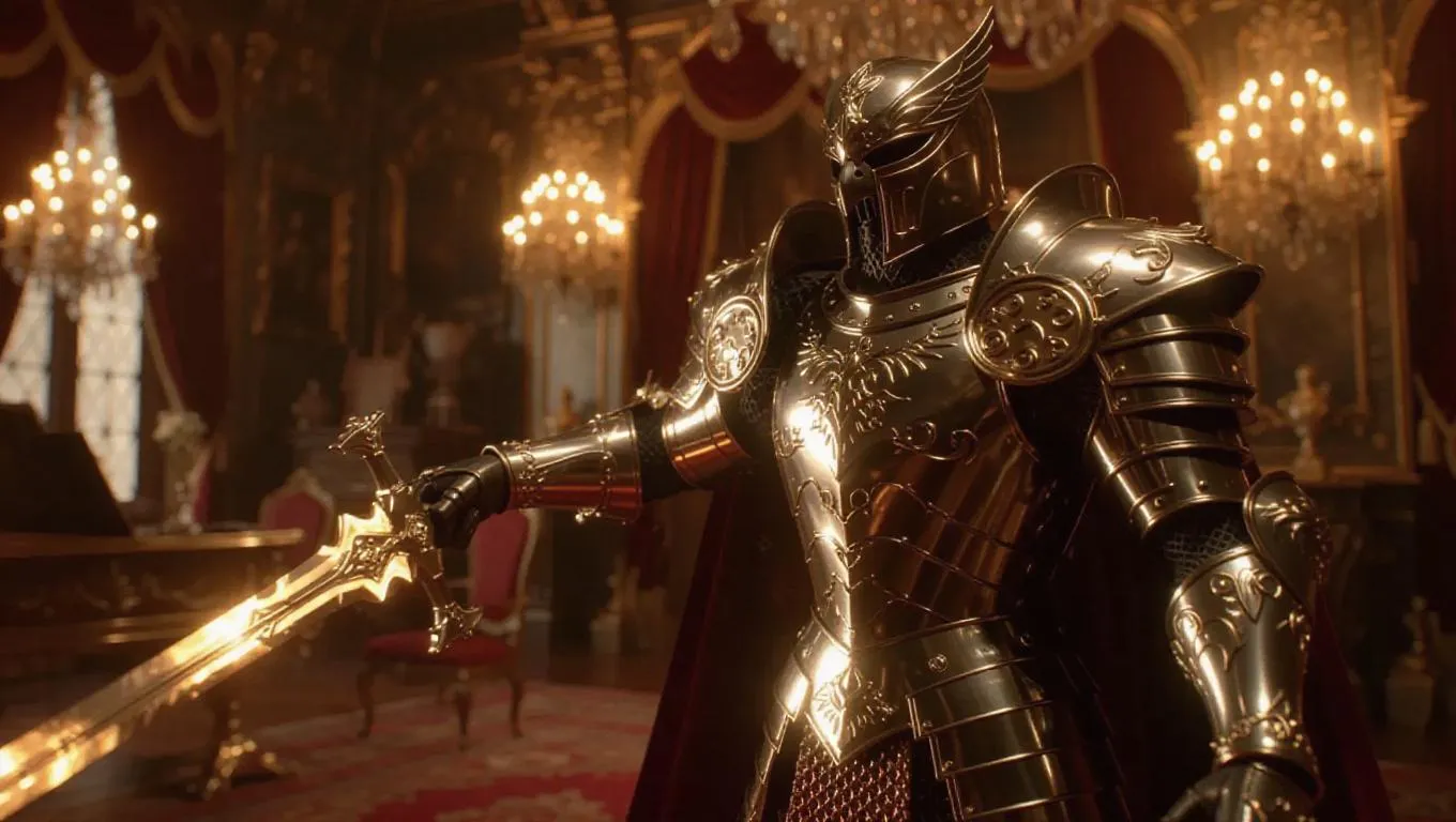 A regal hawk warrior toy, clad in shimmering silver and gold armor with intricate armor sets, wielding a blazing sword. The box showcases an elegant ballroom scene over a grand estate, surrounded by chandeliers and adorned with velvet drapes. Includes a plush suede pouch for accessories. Set in a luxurious workshop with musical instruments and art supplies, bathed in opulent lighting, highlighting the toy's majestic and realistic design.