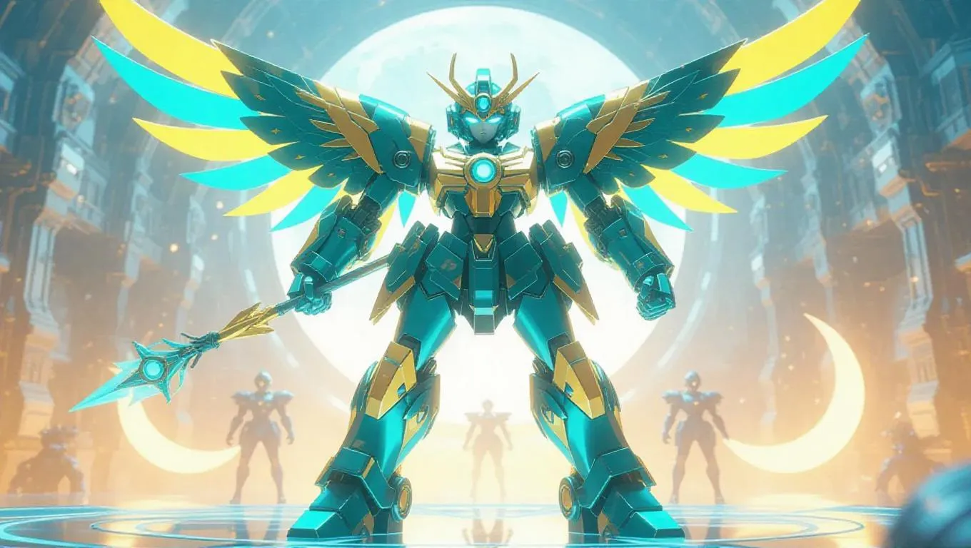 A high-gloss turquoise and yellow robotic Sailor Uranus mech figure with crescent moon wings and a wind-launching wand stands prominently. The packaging is adorned with wind-themed designs and crescent moon-shaped holographic labels, featuring bonus gear arms. The background showcases a magical toy factory filled with floating mechanical gusts and a whimsical, celestial atmosphere. Soft, warm light casts gentle highlights, enhancing the figure’s glossy finish. Style: Cute and futuristic with a touch of cyberpunk flair.