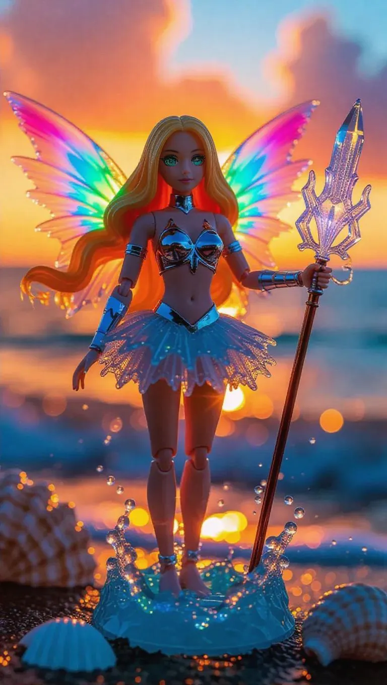 A magical girl action figure with luminous ocean wave wings that ripple in the light, wielding a staff that sprays mist when activated. Her eyes glisten like ocean waves, and her outfit blends colors of the sea. The toy box is adorned with seashell patterns, set against a backdrop of an ocean view under a sunset. Style: Realistic with a sea-inspired fantasy vibe.