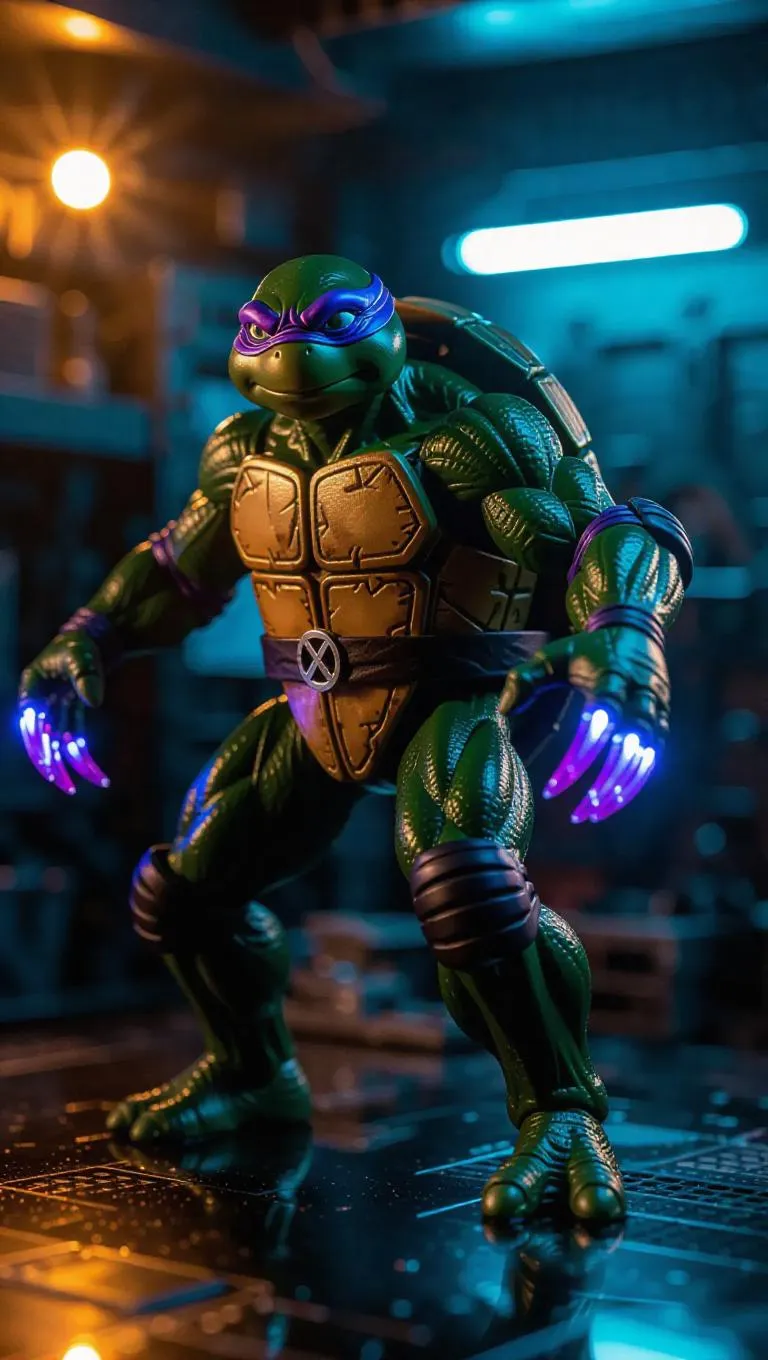 A 1:6 scale superhero turtle figure stands in a charging pose, wearing a dark green nano-suit with iridescent plasma claws. The figure's slow but powerful motion is captured with premium box inserts featuring sturdy motion lines and comic-style effects. Set against a high-energy toy manufacture workshop, the scene is illuminated with gentle blue and fiery gold lights, creating a futuristic and vibrant atmosphere. Style: Hyper-realistic with a touch of comic book flair.