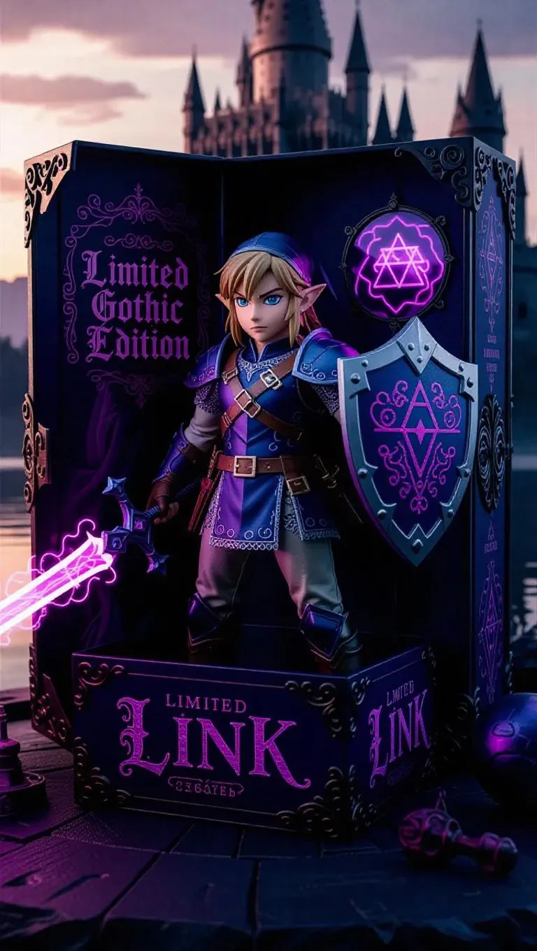 A gothic-inspired collectible action figure of Link, encased in a dark, ornate toy box. Link's gothic redesign features midnight blue armor, glowing pink eyes, and leather accents. His Master Sword is adorned with dark runes and swirling magenta energy cores, while his shield is enhanced with splendid fantasy motifs. The packaging showcases elegant, gothic-style fonts, dark illustrations of Link in flight poses, and a holographic 'Limited Gothic Edition' sticker. Included accessories: Triforce launcher, magical orb. Background: ancient Hyrule Castle, serene lake, soft sunrise. Style: gothic, high detail, dramatic lighting, otherworldly hues.
