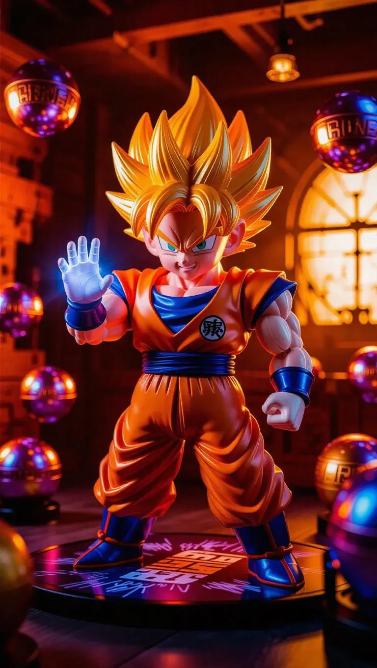 A high-gloss orange and blue robotic Goku mech figure with shimmering energy aura hair and a Kamehameha-launching arm stands prominently. The figure's packaging is adorned with dragon ball-themed designs and energy orb-shaped holographic labels, including bonus gear arms. The background showcases a retro toy factory filled with floating mechanical dragon balls and a nostalgic, warm atmosphere. Soft, warm light casts gentle highlights on the figure, enhancing its glossy finish. Style: Adorable and futuristic with a touch of cyberpunk flair.