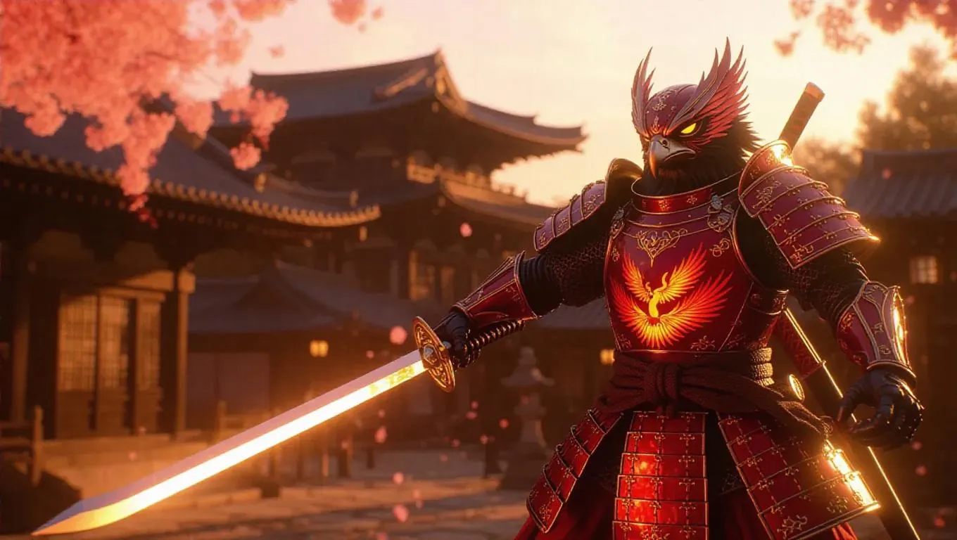 A regal hawk warrior toy, clad in fiery red and orange armor with intricate phoenix feather patterns, wielding a blazing sword. The box showcases a sunrise over a traditional Japanese temple, surrounded by cherry blossoms and adorned with crest stamps. Includes a silk cloth pouch for accessories. Set in a serene temple workshop with incense and ancient scrolls, bathed in golden sunlight, highlighting the toy's majestic and realistic design.
