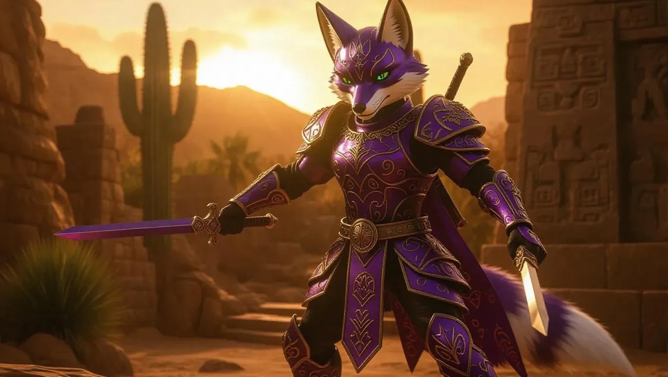 A sleek fox warrior toy clad in purple and bronze armor with intricate celestial patterns, wielding dual sai. The box showcases a fiery desert scene with cacti and Mayan glyphs, including a mesh pouch for accessories. Set in a hidden temple with stone tools and reliefs, illuminated by a blazing sunset, enhancing the toy's mythical design. Style: Realistic.