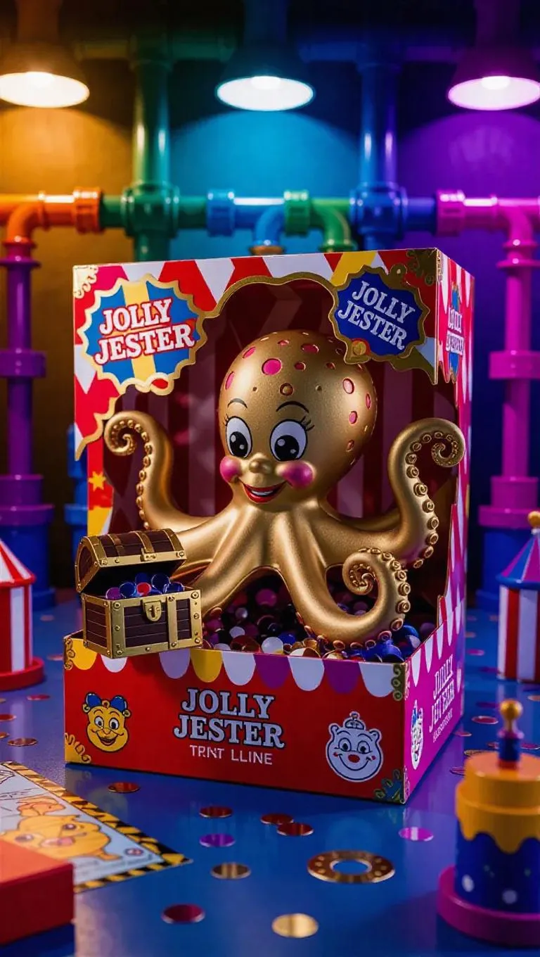 A jovial octopus toy with gold-plated tentacles, a treasure chest cannon, and a clown eye-patch. The box includes a festive map insert, confetti tokens, and a foil "Jolly Jester" tag. Set against a factory background featuring a circus-themed toy line with bubbly tubes and water pumps. Bright, cheerful light illuminates the scene, casting playful shadows and highlighting the metallic sheen of the gold-plated tentacles. Realistic style with a touch of whimsy.