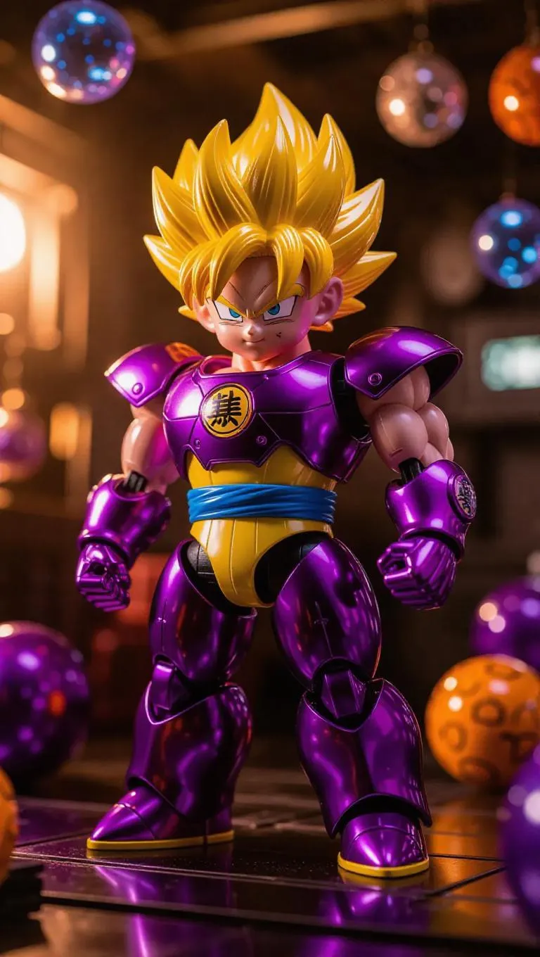 A high-gloss purple and yellow robotic Goku mech figure with energy aura hair and a Kamehameha-launching arm stands prominently. The figure's packaging is adorned with dragon ball-themed designs and energy orb-shaped holographic labels, including bonus gear arms. The background showcases a vintage toy factory filled with floating mechanical dragon balls and an electrifying, spirited atmosphere. Soft, warm light casts gentle highlights on the figure, enhancing its glossy finish. Style: Adorable and futuristic with a touch of cyberpunk flair.