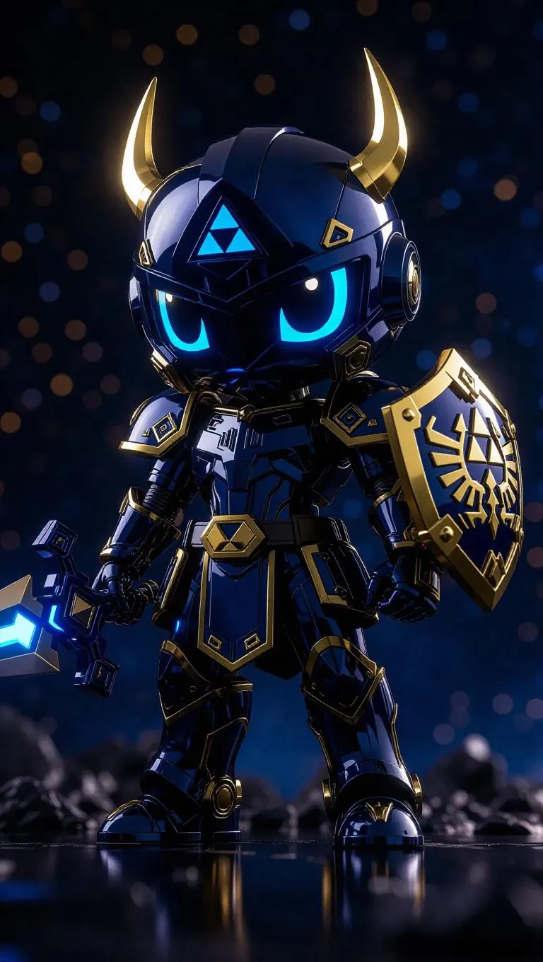 A high-gloss navy and gold robotic Link mech figure with Master Sword, shield, and Triforce-launching bow stands prominently. The packaging features celestial-themed designs and shield-shaped holographic labels, including bonus gear arms. The background is a night sky with floating mechanical arrows, mystical lights, and an adventurous atmosphere. Soft, silver light enhances the figure's glossy finish, blending cute and futuristic aesthetics with a dreamlike quality.