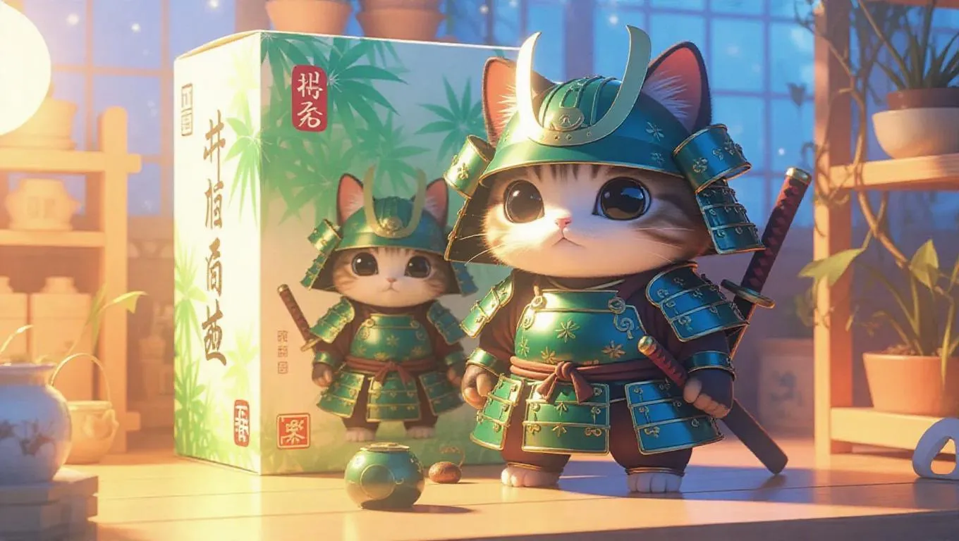 A samurai cat warrior toy clad in lacquered emerald armor adorned with tree patterns and quad blade tails. The box features bamboo illustrations, Japanese calligraphy, and a cotton pouch. Set against a creative workshop with whimsical toy shelves, the scene is illuminated by warm, enchanted light, casting magical shadows that enhance the toy's detailed craftsmanship. Style: Realistic.