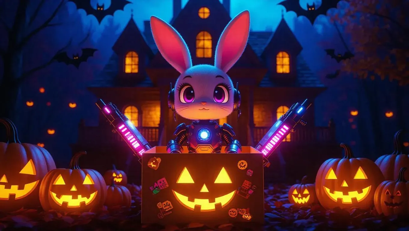 An anime-styled robot bunny with floppy ears, a jetpack tail, and vivid eyes stands in a Halloween-themed box adorned with pumpkins, glowing stickers, and spooky decals. The background features a bunny-themed haunted house, with floating bats adding a whimsical touch. Soft, eerie light enhances the autumn colors, creating a spooky yet vibrant atmosphere. The style is playful and cartoonish, with clean lines and exaggerated features.