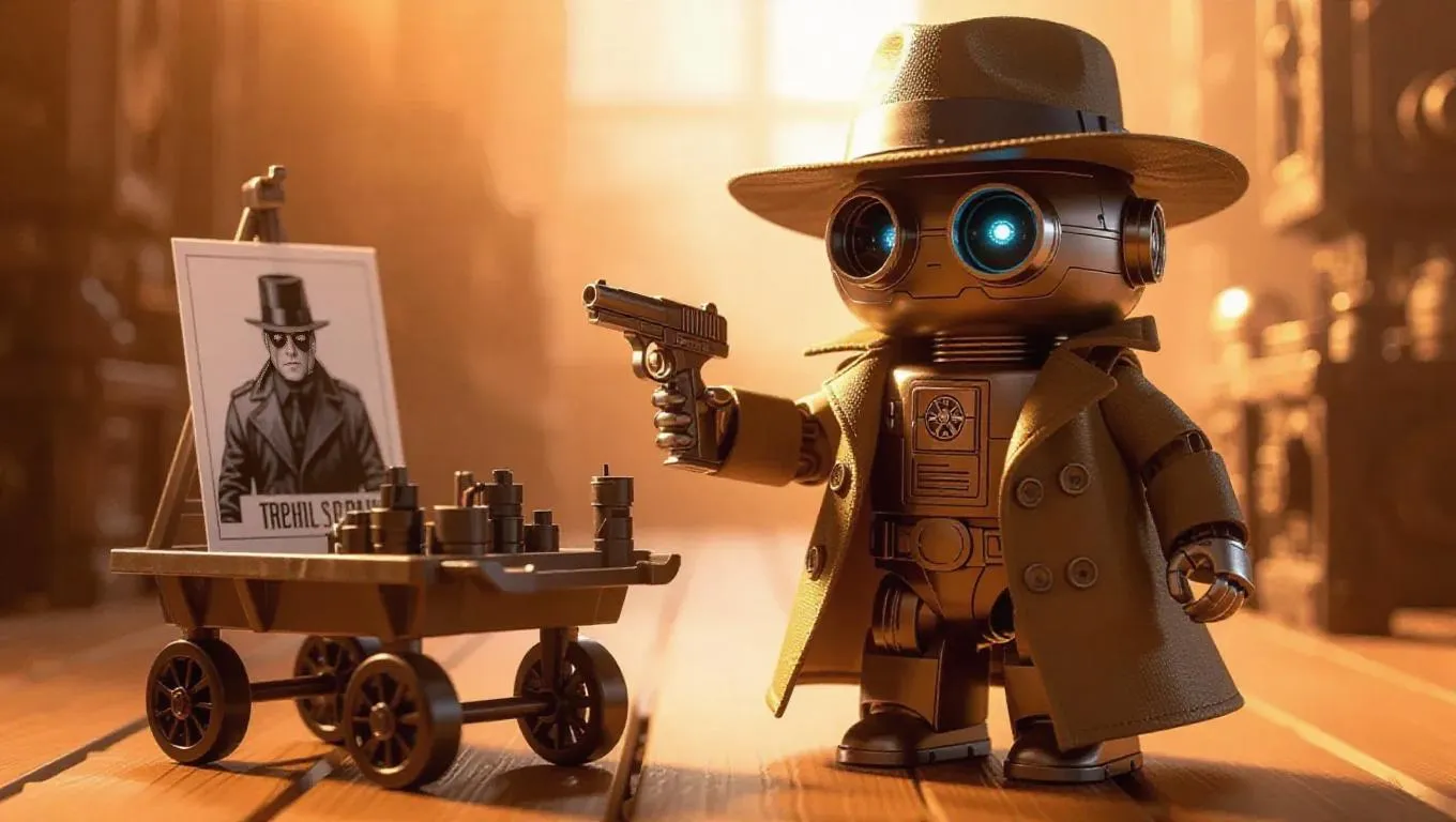 A toy detective droid with a pointed-eye scanner that detects anomalies, a trench-coat made of tactical fabric, and a fedora with an embedded compass. Matte-brown body with silver highlights, adventurous detective features. Rolling crime-scene cart with trail markers and forensic tools, illustrated poster of an enigmatic figure. Soft orange-toned lighting, adventurous atmosphere, explorative style.