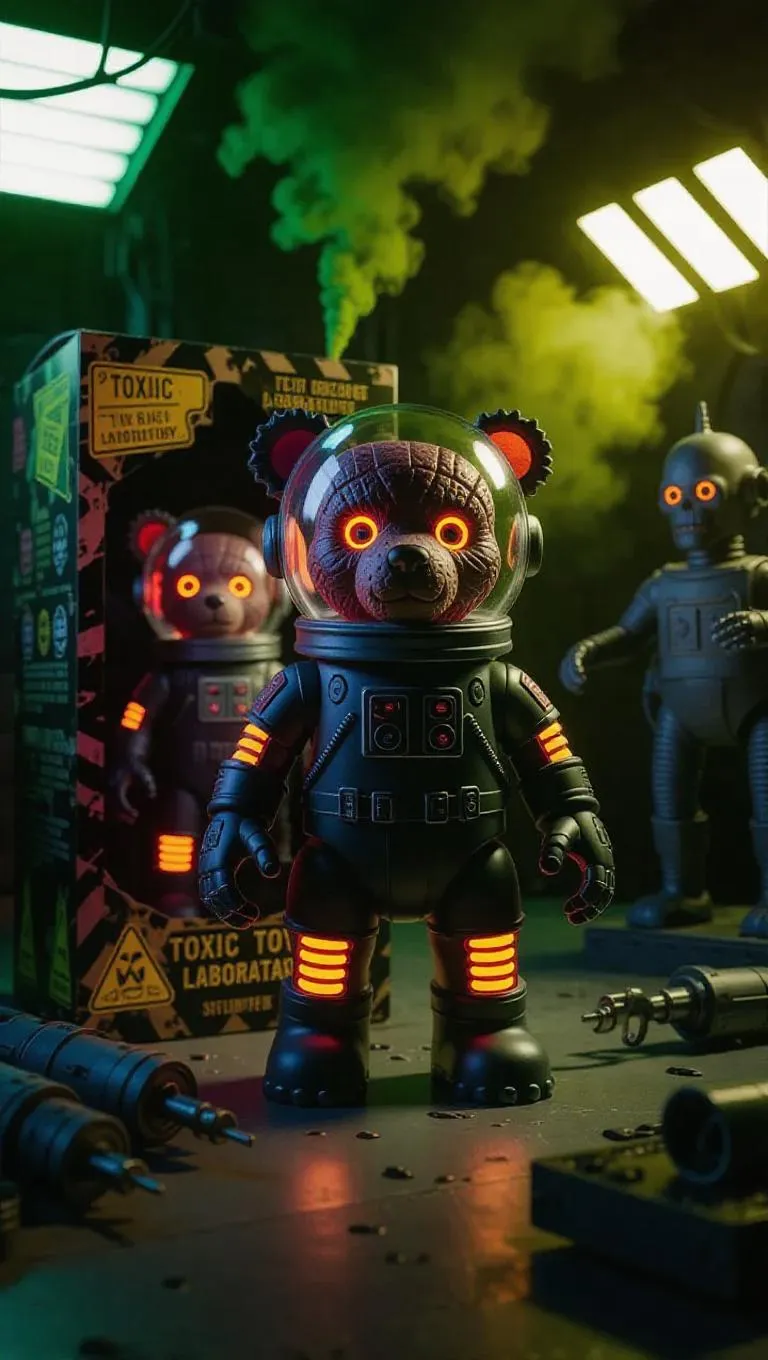 A limited-edition zombie astronaut bear toy stands out with stitched limbs, glowing orange ooze tubes, and a cracked glass helmet. The box features glow-in-the-dark warning labels and "Toxic Toy Laboratory" branding, complete with robotic accessory pieces. In the background, the laboratory leaks green smoke and casts strange lights, creating a hauntingly surreal atmosphere. The scene is bathed in a mix of hard, green-tinted light and soft, yellow shadows, enhancing the dystopian vibe. Style: Dark, futuristic realism.