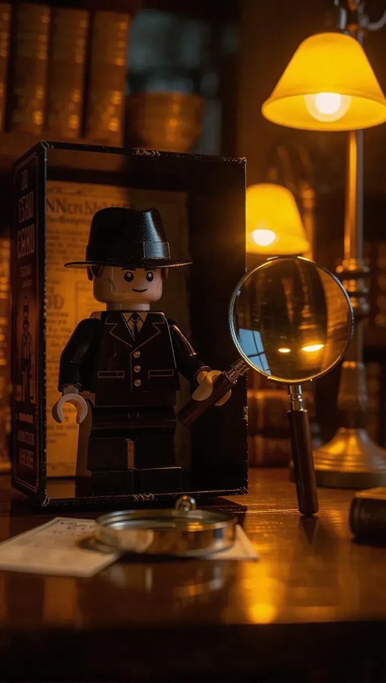 A classic toy detective with golden accents stands beside a magnifying glass platform inside his mystery-themed packaging. The box showcases a removable fedora sticker. In a dimly lit detective toy factory, yellow-brown lamps create suspenseful shadows, enhancing the intriguing, enigmatic atmosphere. Realistic detective aesthetics.
