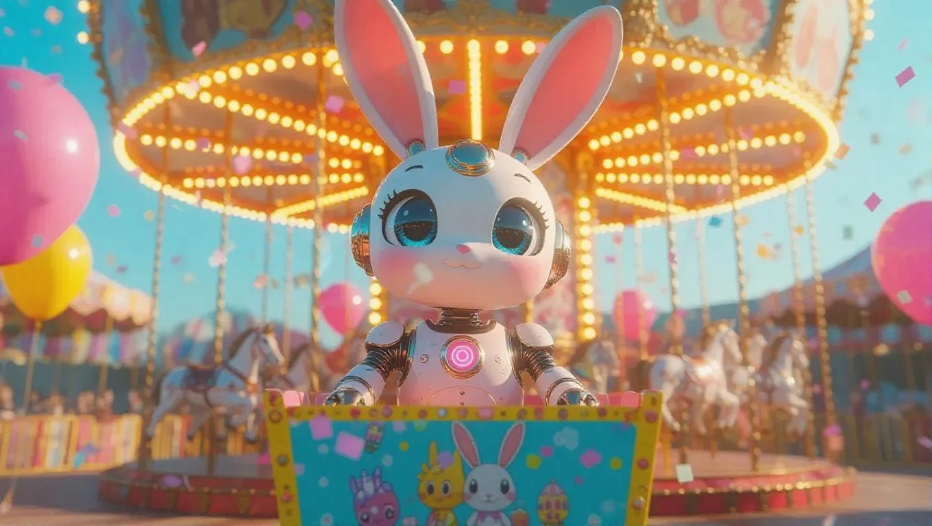 An anime-styled robot bunny with propeller ears, a balloon tail, and sparkling eyes stands in a carnival-themed box adorned with balloons, glowing stickers, and funfair decals. The background features a bunny-themed carousel, with floating confetti adding a whimsical touch. Soft, bright light enhances the festive colors, creating a joyful and vibrant atmosphere. The style is playful and cartoonish, with clean lines and exaggerated features.