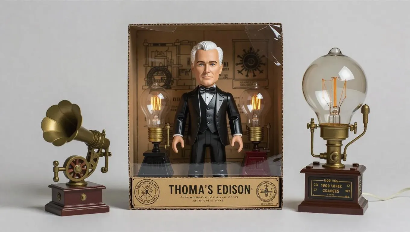 A realistic product photograph of an action figure box set featuring Thomas Edison. The action figure is packaged inside a vintage invention-themed cardboard box with a clear front window. Include relevant assets/accessories such as: a miniature phonograph, light bulb, invention blueprints. The figure itself looks detailed, slightly stylized, with his slicked-back hair. High-quality lighting, clean background, studio style, product photography