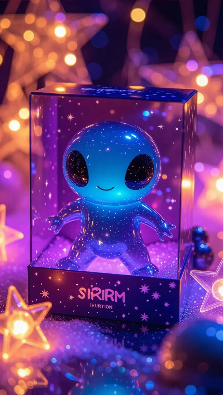A toy alien jelly figure made of sparkling crystal-like material, showcasing glittering eyes and radiant trails. The box is adorned with celestial-themed graphics, including a star-shaped accessory and luminescent elements. The factory setting is a starry toy assembly area, complete with glowing orbs and cosmic backgrounds. Starry, shimmering lighting enhances the gelatinous texture, creating a celestial and wondrous atmosphere. The style is mystical and slightly dreamy, blending cosmic elements with whimsical illustrations.