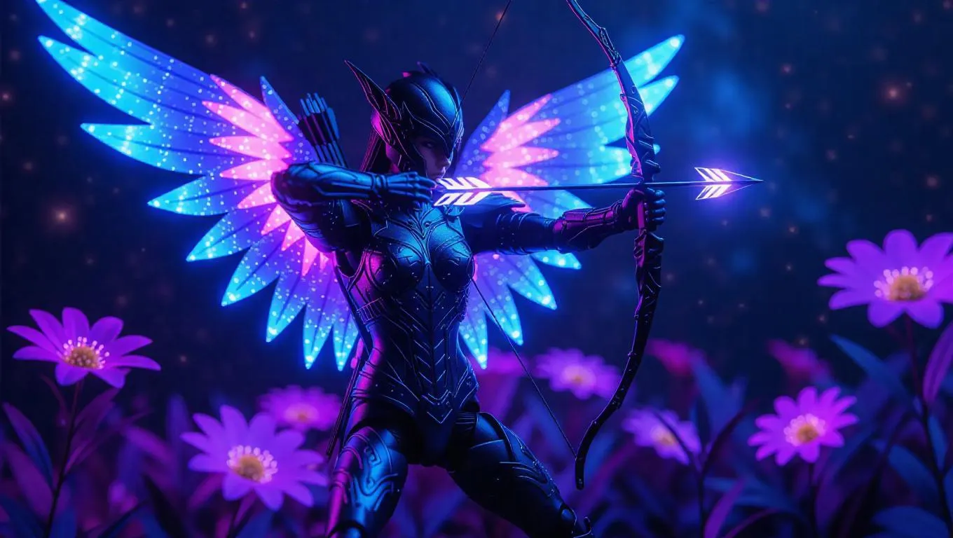 A celestial archer action figure with radiant star-shaped wings and a bow emitting cosmic energy, clad in an outfit adorned with interstellar dust. Toy box features a galactic swirl design. Background: A magical meadow with fireflies and shimmering flowers. Style: Hyper-realistic with a nature fantasy twist.