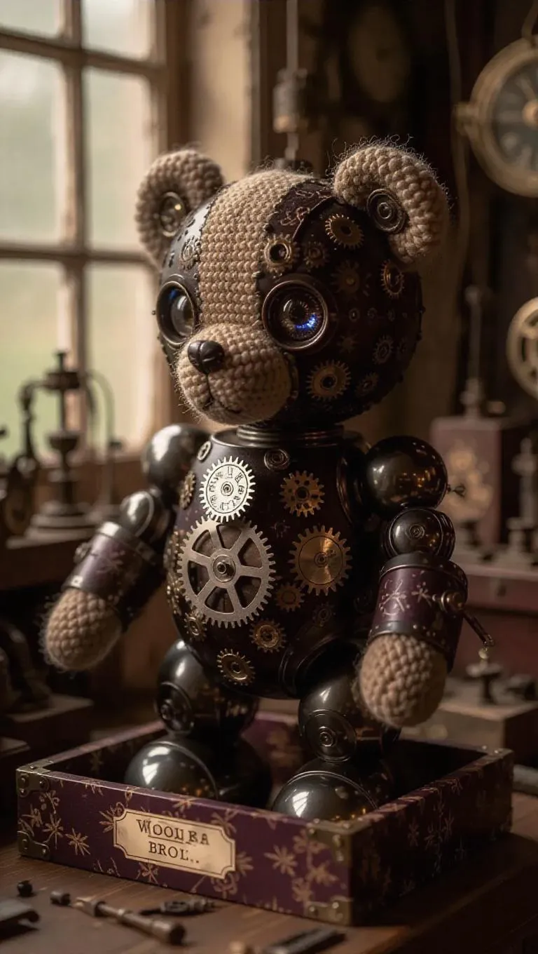 A steampunk teddy bear toy made from chrome gears, woolen patches, and mirror eyes, featuring a winding key on its back. It stands in a collector’s box with patterned textures, a faux-silk label, and a clear glass window frame. The scene is set inside a vintage toy workshop, surrounded by tools and machinery. Soft, lavender light filters through the windows, casting artistic shadows and emphasizing the bear’s intricate features and the workshop's details. The style is realistic, highlighting the tactile and mechanical elements.