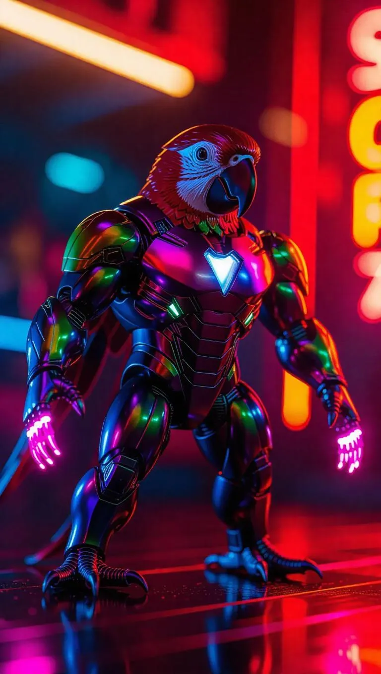 A 1:6 scale superhero parrot figure stands in a vibrant pose, wearing a rainbow-themed nano-suit with shimmering plasma claws. The figure's colorful motion is captured with premium box inserts featuring swirling motion lines and comic-style effects. Set against a high-energy toy crafting room, the scene is illuminated with bright red and electric blue lights, creating a futuristic and vibrant atmosphere. Style: Hyper-realistic with a touch of comic book flair.