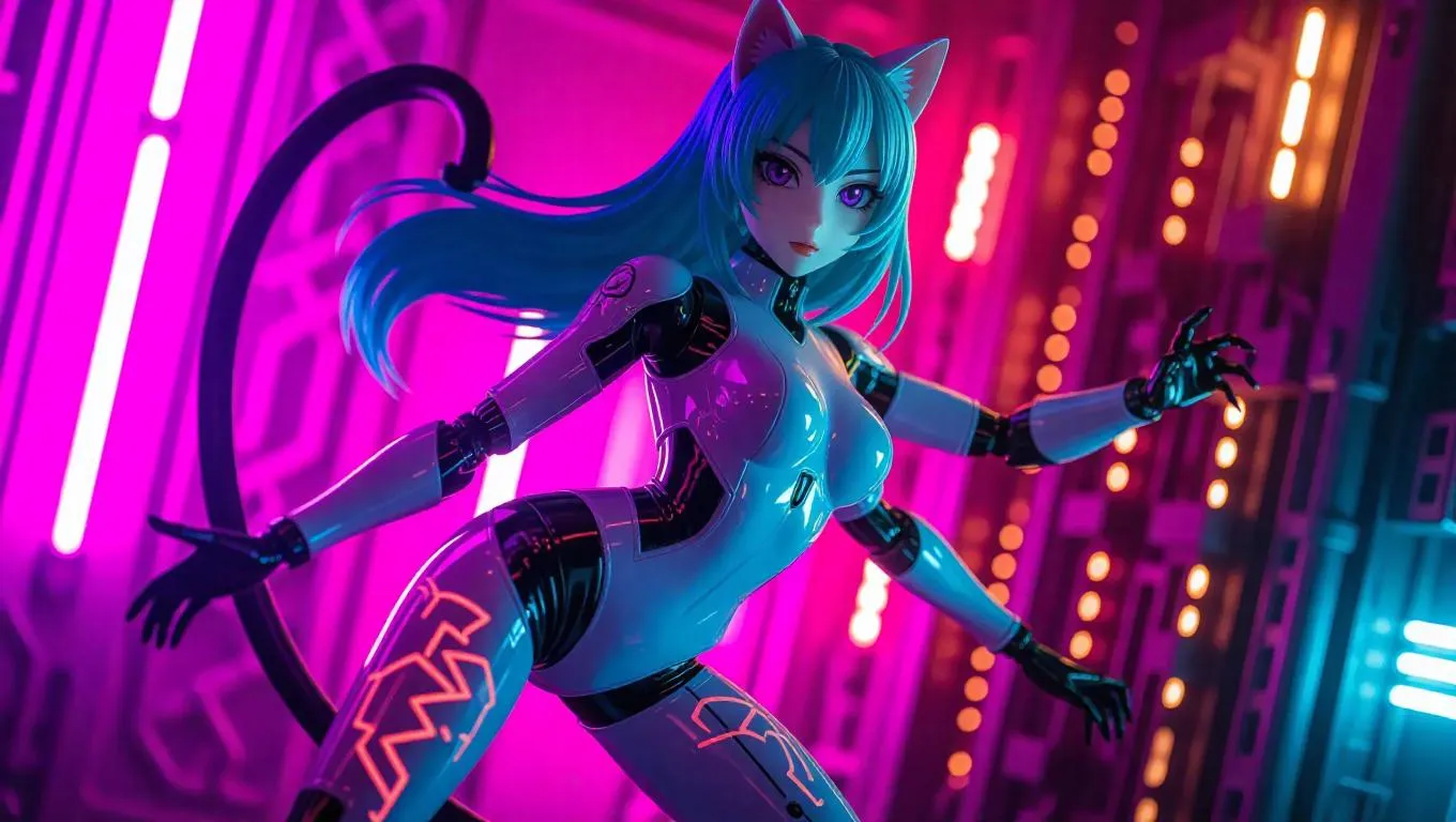 A futuristic catgirl action figure, with a flexible tail whip and a glossy white bodysuit, features glowing orange tattoos on her thighs. Her medium-length teal hair and intense purple eyes amplify her dramatic aesthetic. The packaging glows with electric cyan neon patterns and has snap-button closure panels. Set against a vibrant toy factory backdrop, with sparks, autonomous delivery drones, and energy conduits embedded in the walls. Lighting is bright and cheerful, creating lively shadows and highlights. Style: Sci-Fi, Cyberpunk.