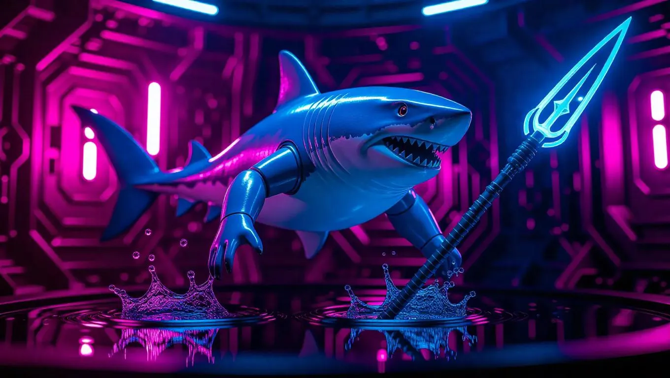 A 1:6 scale superhero shark figure in a dynamic underwater pose, wearing a sleek blue nano-suit with glowing gills and a laser trident. Premium box inserts feature water splash effects and comic-style bubbles. Set against a high-energy toy prototyping chamber, illuminated with cool blue and violet lights, hyper-realistic with a touch of comic book flair.