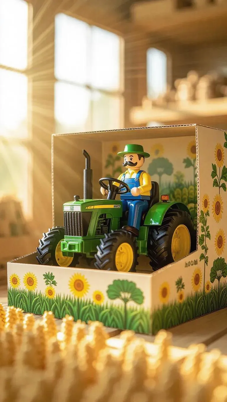 A vintage toy farmer with green accents rides on a tractor platform inside his agricultural-themed packaging. The box showcases a removable crop sticker. In a sunlit farming toy factory, golden rays filter through windows, enhancing the fresh, productive atmosphere. Realistic farming aesthetics.