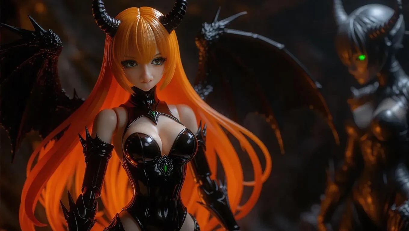 A seductive demon girl action figure with black horns, angel-like wings, and a snug silver latex outfit adorned with emerald accents. Her long, flowing orange hair shimmers, and her green eyes have an eerie luminescence. The toy packaging features demonic glyphs, dark suede textures, and a transparent crimson-tinted window. In the factory, molten molds and glimmering mist surround the assembly lines, creating a forbidden, otherworldly atmosphere. Lighting is brooding with light, warm highlights and inky shadows. Style: Dark Fantasy, Gothic.