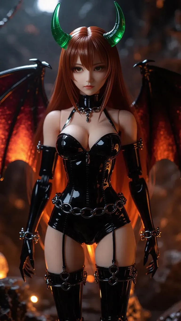 A seductive demon girl action figure with jade green horns, dragon-like wings, and a tight black latex outfit adorned with silver chains. Her long, flowing auburn hair shimmers, and her amber eyes have an alluring glow. The toy packaging features cursed markings, dark faux-leather textures, and a transparent crimson-streaked window. In the factory, glowing molds and smoky torrents surround the assembly lines, creating a forbidden, dramatic atmosphere. Lighting is somber with intense highlights and deep shadows. Style: Dark Fantasy, Gothic.