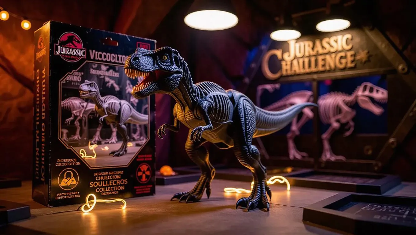 A mechanized velociraptor figure with rubber feet and an electrified trail stands poised in a dino-themed escape room. The figure's packaging features mysterious dinosaur skeleton overlays, escape symbols, and "Jurassic Challenge Collection" branding. Puzzles and interactive devices fill the background, lit by flickering mystery lights. The atmosphere adopts an adventurous and suspenseful tone, emphasizing the intricate design of the figure and the immersive escape room experience.