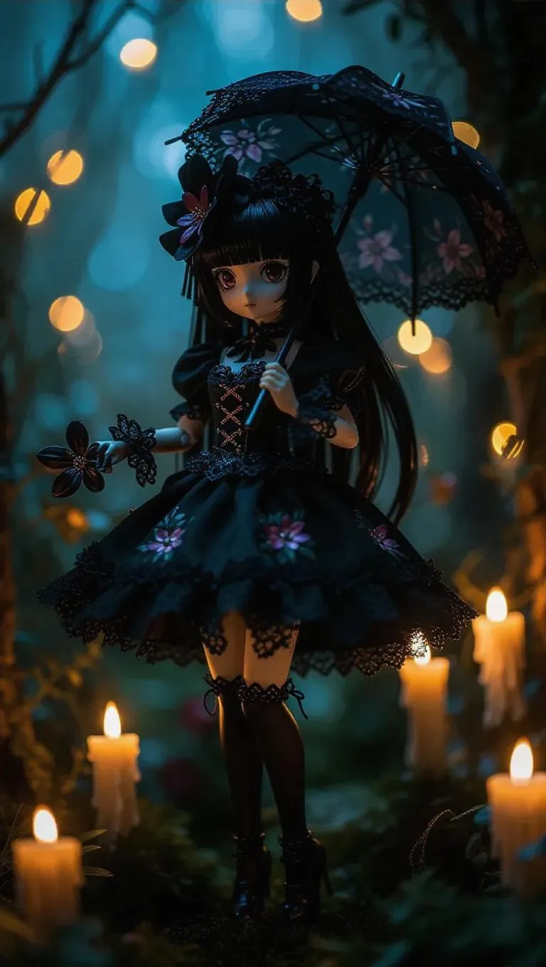 A gothic lolita action figure, dark and enchanting, dressed in a lavish dress adorned with intricate flower and petal motifs. Wields a parasol that transforms into a flower whip. Toy box showcases a hauntingly beautiful garden surrounded by luminescent insects. Background: A shadowy grove with flickering candles casting organic shadows.