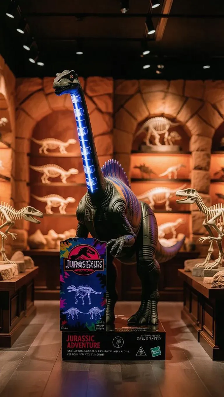 A robotic Brachiosaurus model with treaded feet and a plasma-blasting neck towers gracefully in a dino-themed retail space. The figure's packaging features colorful dinosaur skeleton overlays, consumer warnings, and "Jurassic Adventure Series" branding. Ancient stone sculptures and display shelves fill the background, infused with warm, inviting retail lighting. The ambiance reflects a harmonious blend of the ancient past and futuristic design, with a charming style that underscores the unique features of the robotic figure and the shop atmosphere.